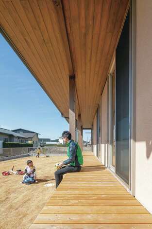 広い庭と室内をつなぐ縁側のようなウッドデッキ 深い軒が夏の直射日光を遮り 冬は室内の奥まで柔らかな光を届ける イエタテ